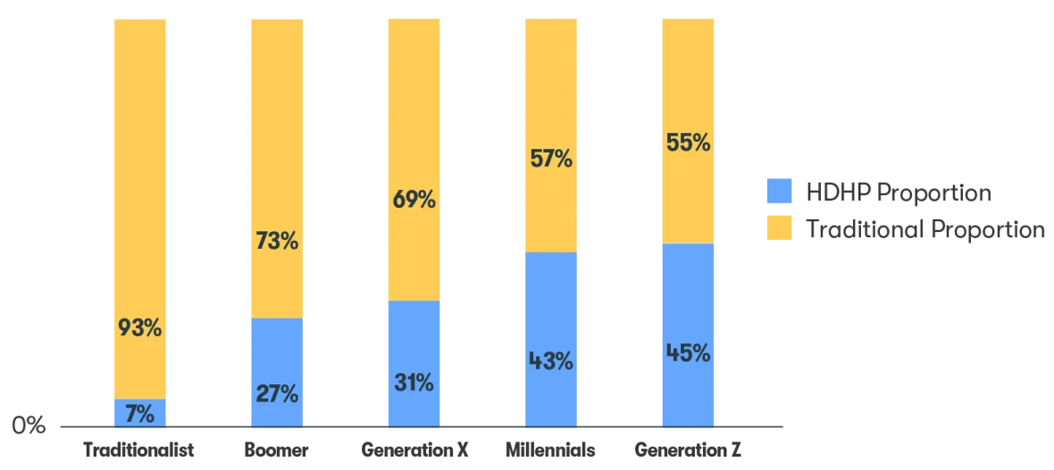 - Highest high-deductible health plan (HDHP) participation among all generations in the workforce, when offered alongside traditional health plans.